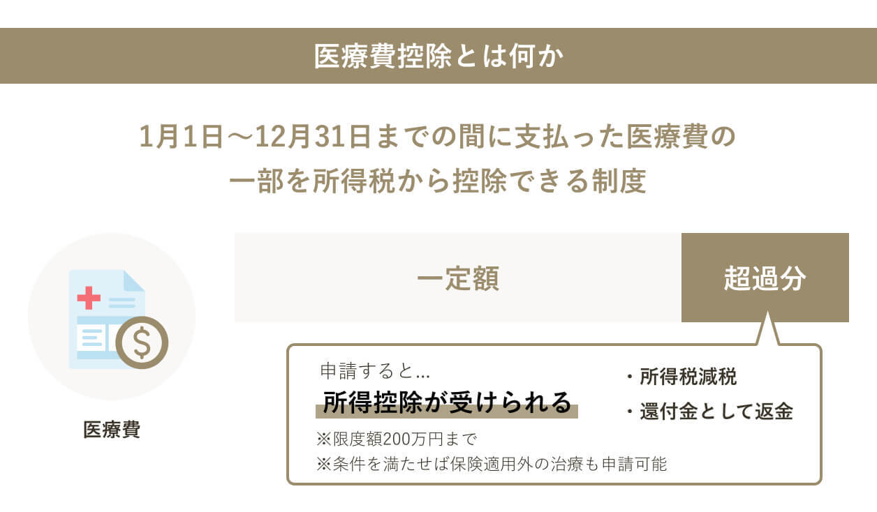 医療費控除とは、支払った医療費の一部を所得税から控除できる制度です。 |