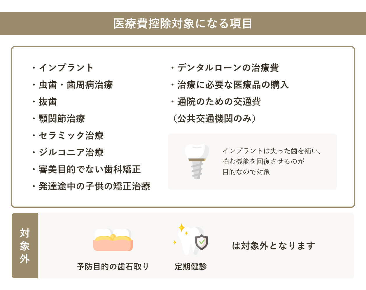 歯科医院で受けられるインプラントは、医療費控除の対象になります。 なお、予防を目的とした歯石取りや定期的な検診の医療費は対象外となるため、注意してください。治療を目的としたものが対象になると覚えておきましょう。 |